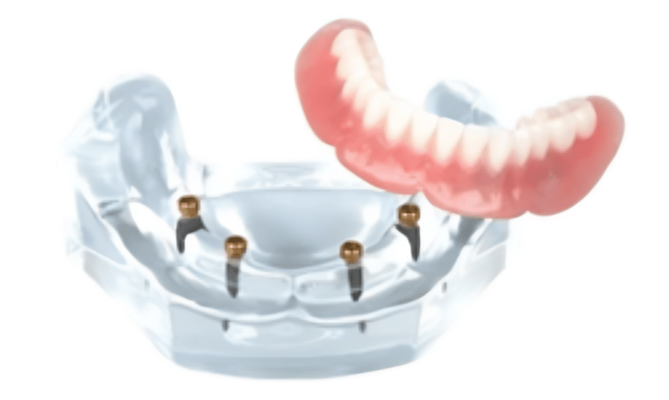 An overdenture isa type of removable, implant-retained prosthesis that looks like a traditional denture but provides more stability and a better fit by attaching to dental implants. It features an artificial arch of teeth and a gum-colored base, which snaps onto attachments on the implants, offering greater comfort, improved chewing ability, and a more secure feel compared to conventional dentures.